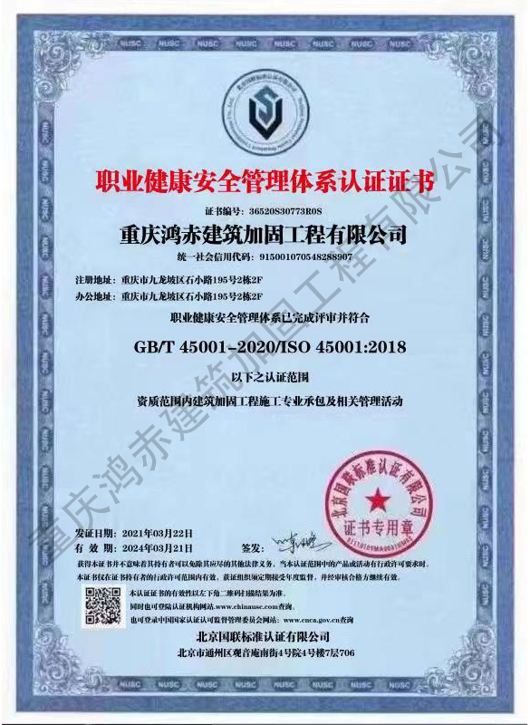 职业健康安全管理体系认证证书